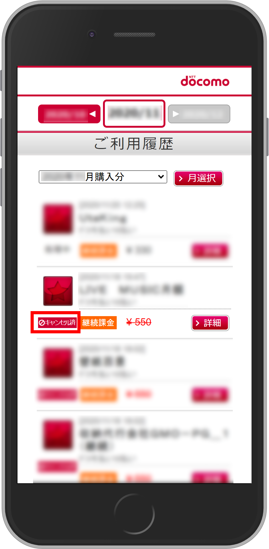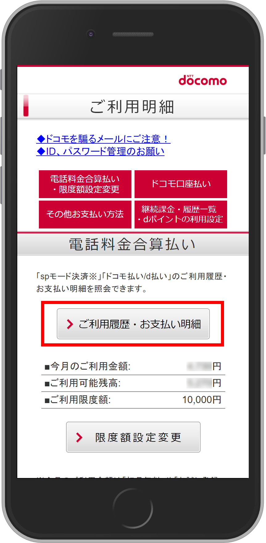 ④[ご利用履歴・お支払明細]をタップ