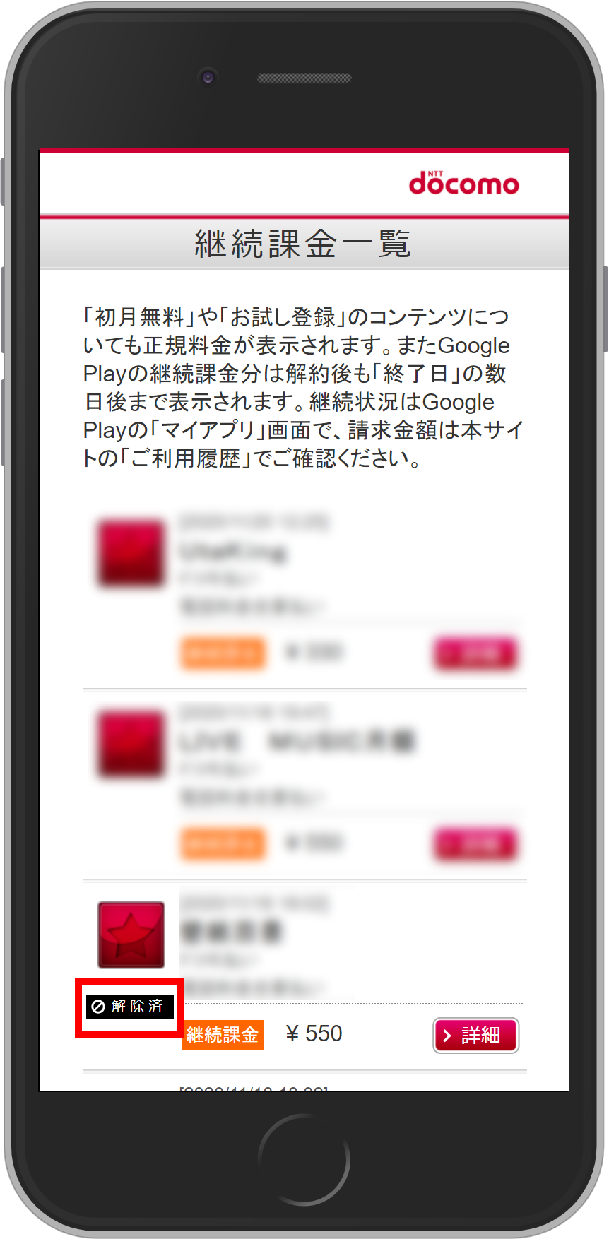※[解除済]の表記が確認取れれば、継続課金の登録は解除されております